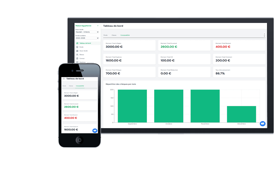 Tableaux de bord en temps réel pour le suivi détaillé et le pilotage de votre Madrassah