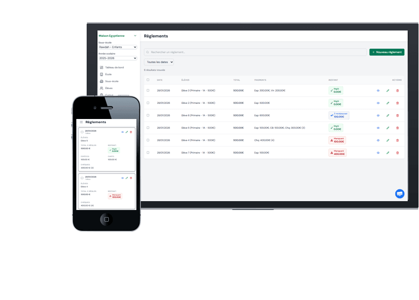 Madrass'App nous fait gagner un temps fou. Avant le suivi était casi impossible avec des fichiers excel pas à jour. Aujourd'hui nous avons la maitrise de nos règlements et de notre budget ce qui nous simplifie considérablement la vie